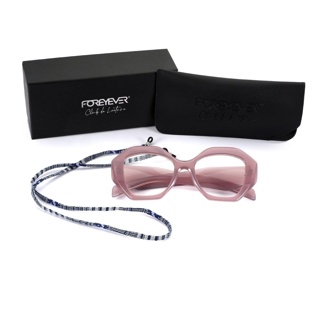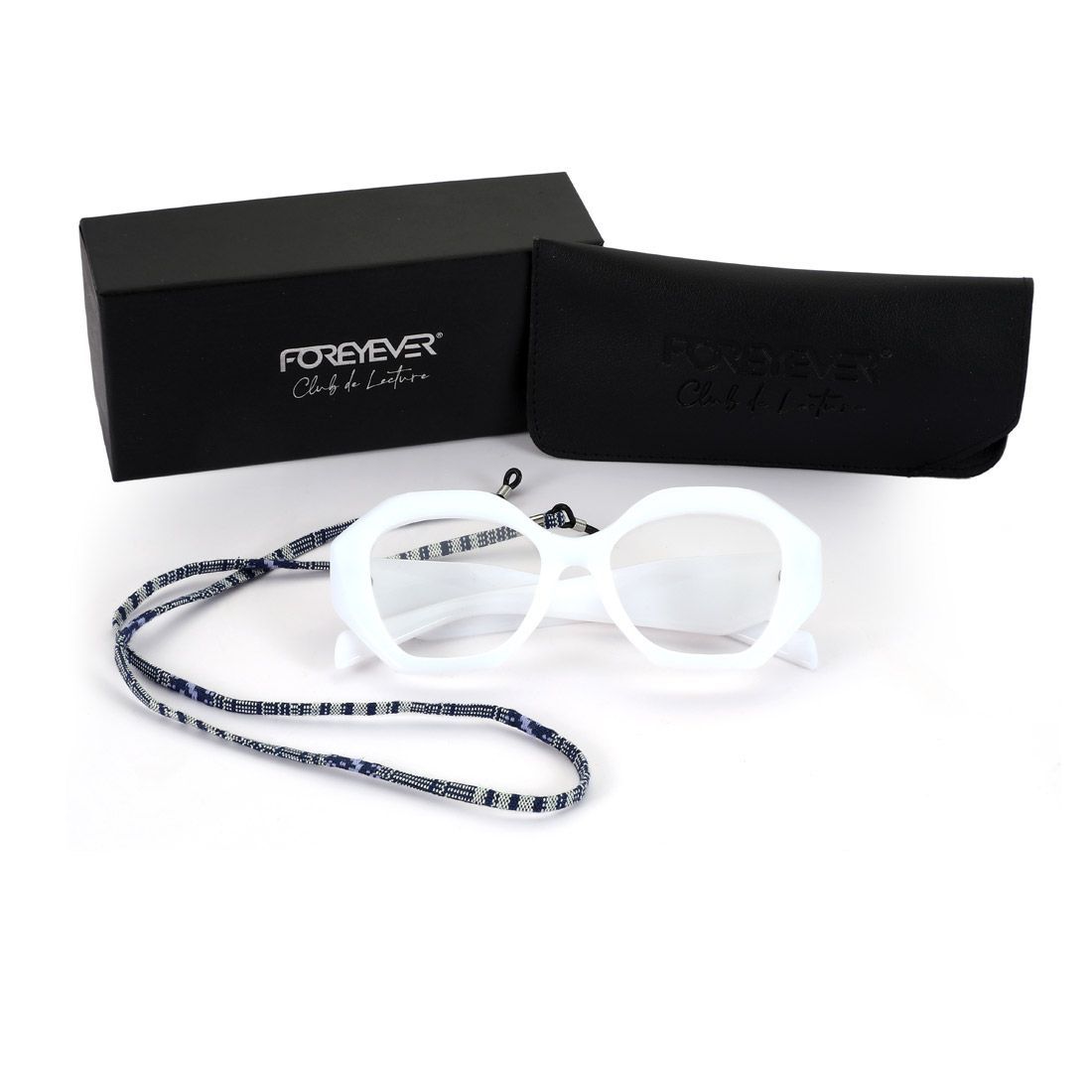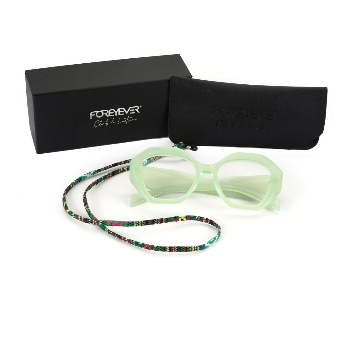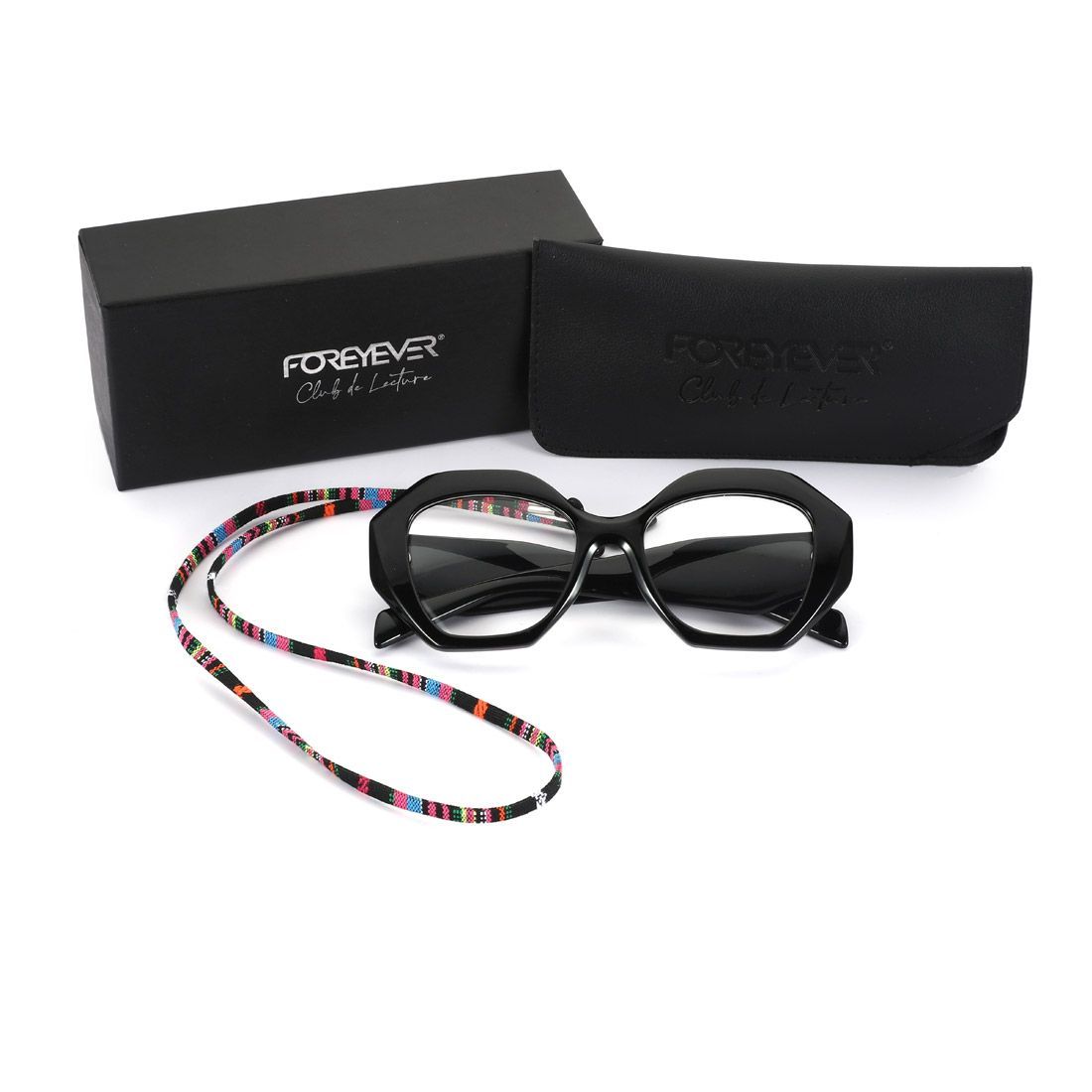 Elegante confezione regalo nera con logo Foreyever Club de Lecture in silver foil, astuccio in eco-pelle con logo inciso, cordicella colorata per appendere comodamente gli occhiali intorno al collo quando non indossati.