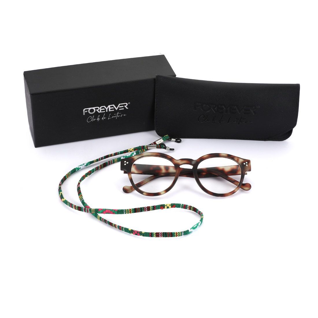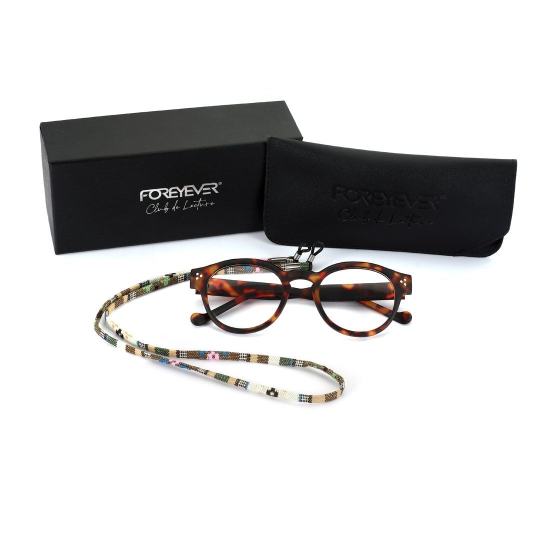 Elegante confezione regalo nera con logo Foreyever Club de Lecture in silver foil, astuccio in eco-pelle con logo inciso, cordicella colorata per appendere comodamente gli occhiali intorno al collo quando non indossati.