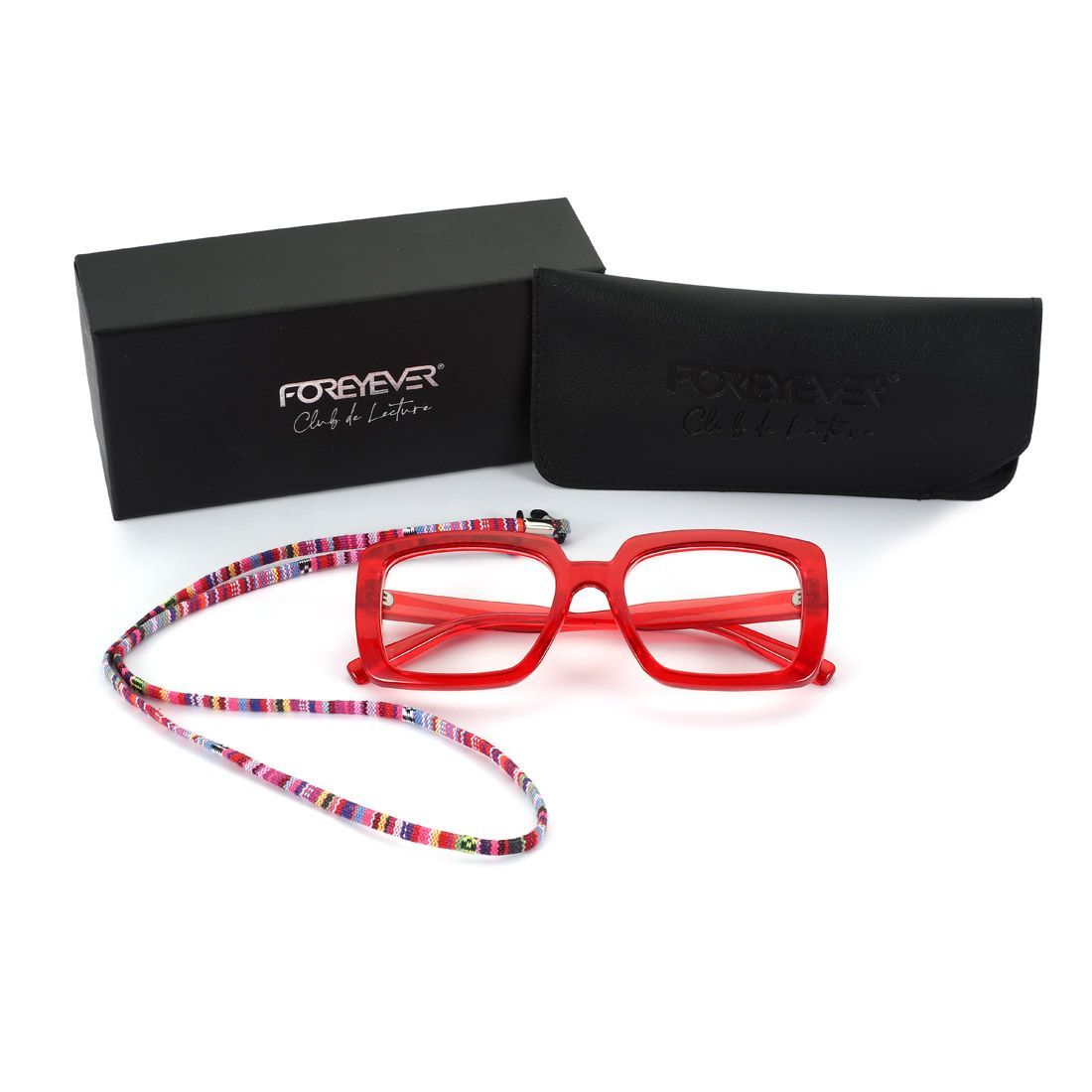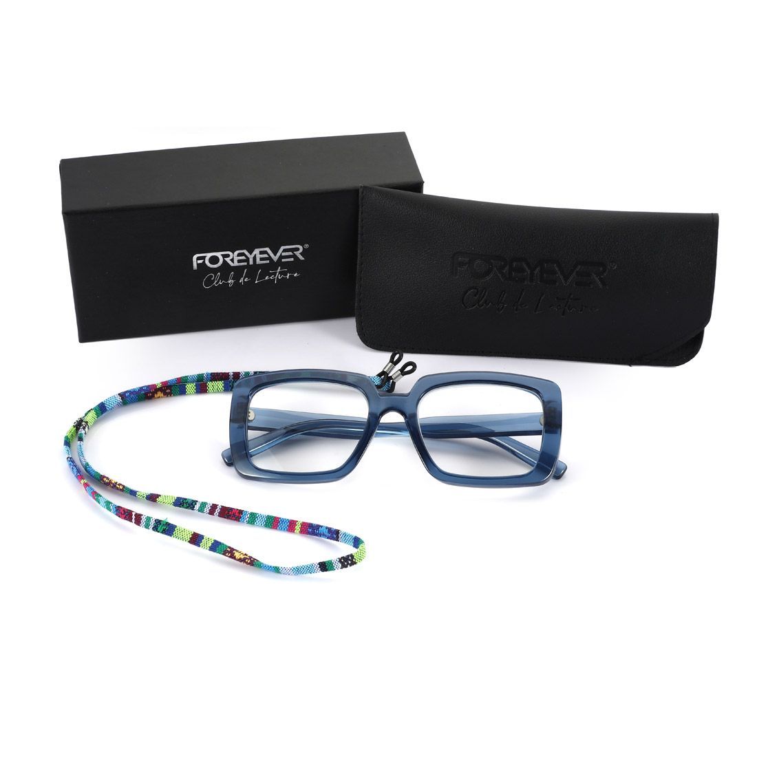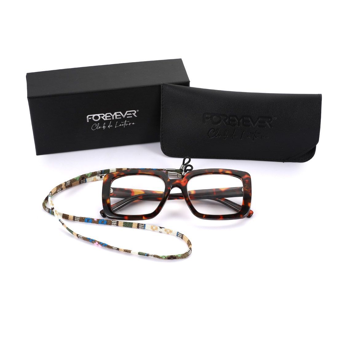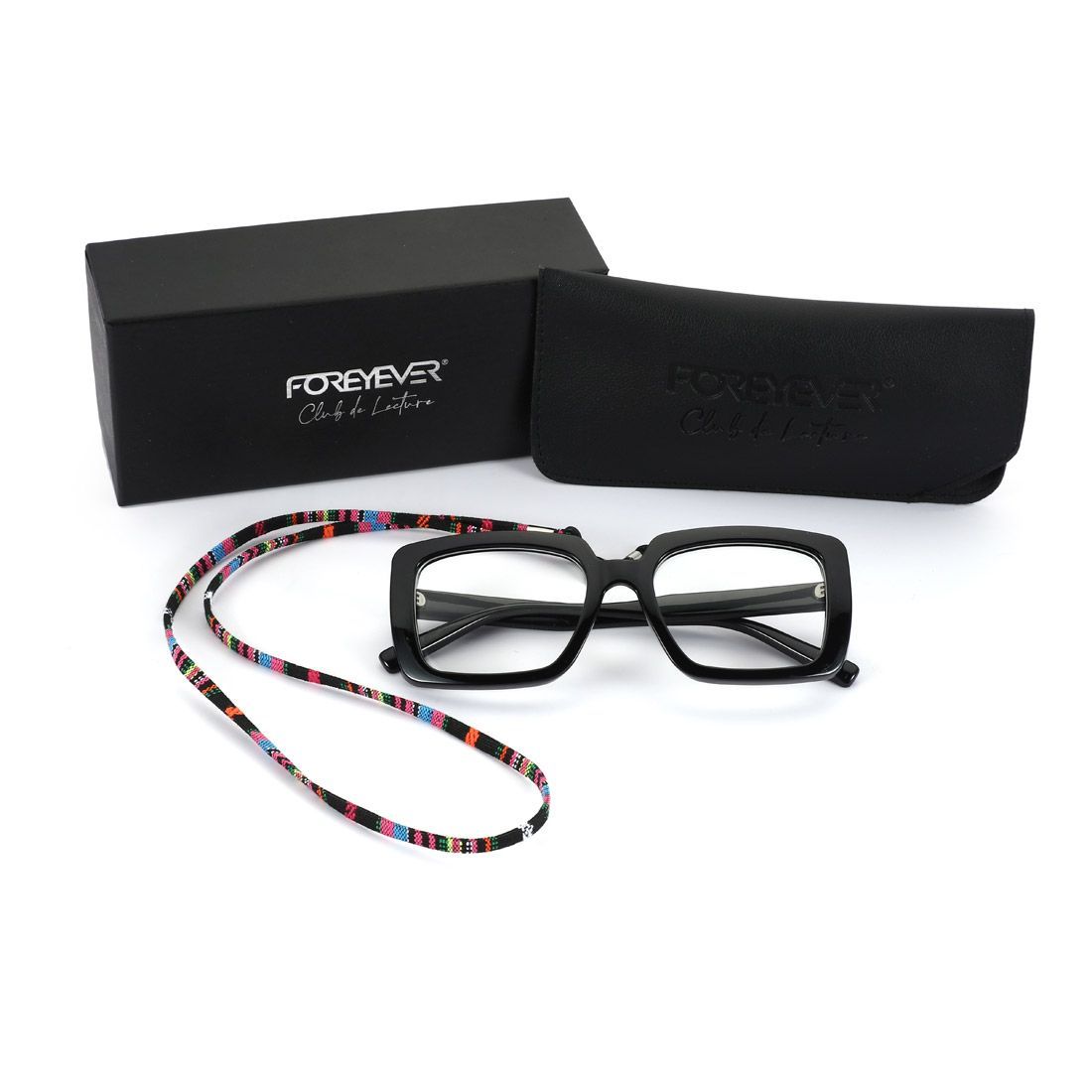 Elegante confezione regalo nera con logo Foreyever Club de Lecture in silver foil, astuccio in eco-pelle con logo inciso, cordicella colorata per appendere comodamente gli occhiali intorno al collo quando non indossati.